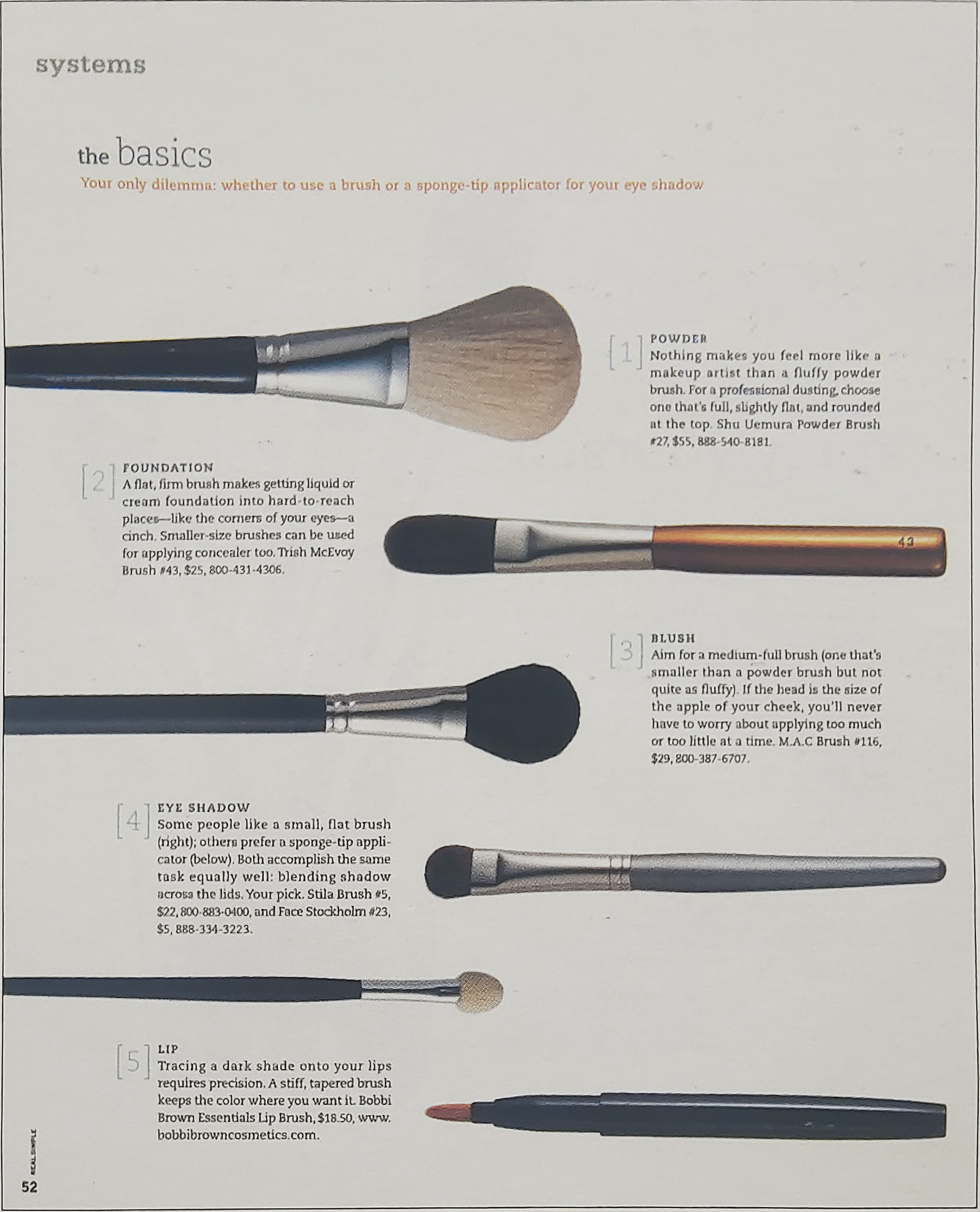 該雜志的特色之一就是將產品列成目錄以便忙碌的婦女們能夠快速地查找出她們所需的內容。每個條目都配有照片進行說明,就像關于化妝筆和器具的綱要一樣。