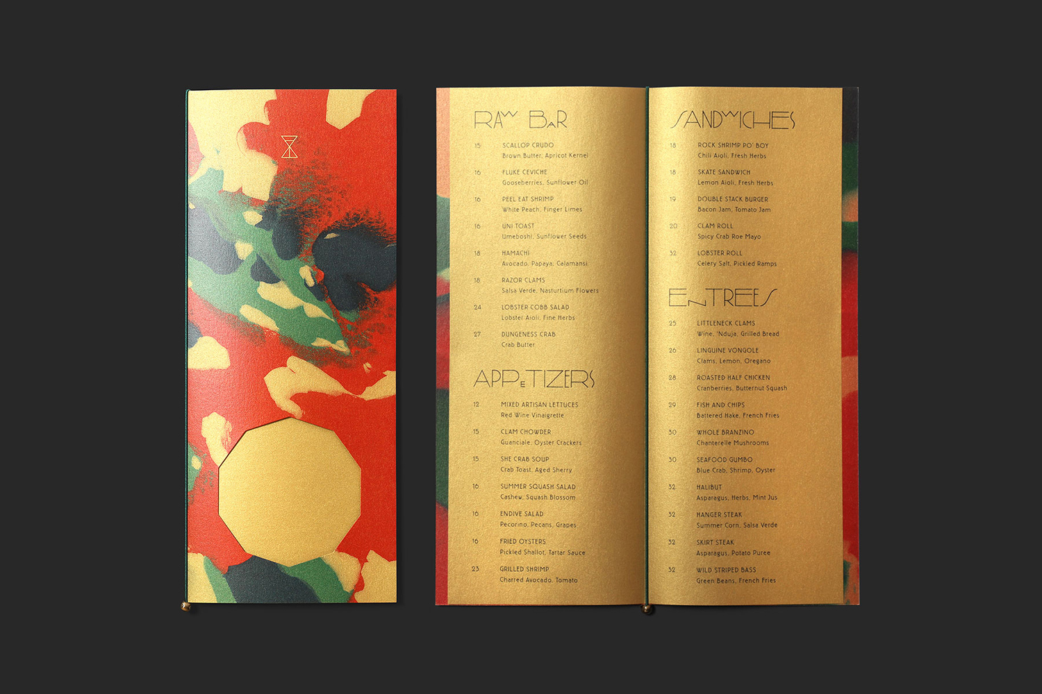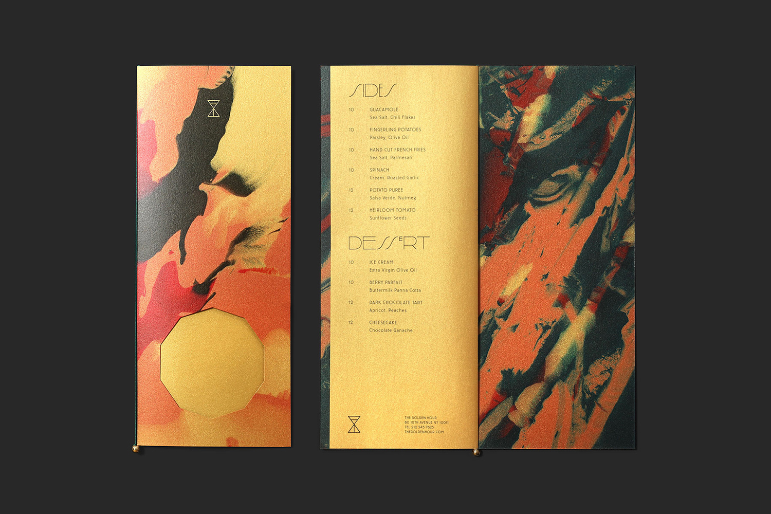 金色時刻標志是一個簡單的沙漏,它起到了關鍵的作用,就像用一種直接的方式命名時間和時間流逝的中心前提,捕捉田園詩般的時刻,夏日落日的色彩和溫暖。這是在一家致力于季節性的餐廳的背景下進行的,這進一步證明了這一點。Triboro將其作為一種獨特的圖形和材質表現。